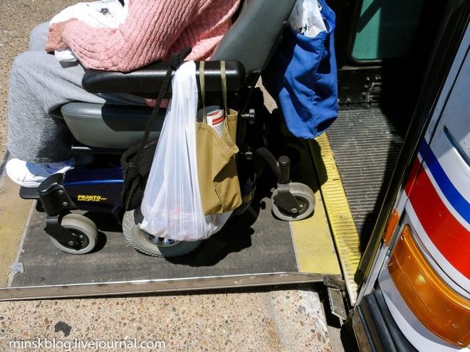 Инвалиды в США считаются полноценными членами общества, для них создана вся необходимая инфраструктура: ровные тротуары, заниженные пандусы, заниженные кнопки в лифтах и на светофорах. Общественный транспорт при этом оборудован пневмоподвеской, благодаря которой автобус наклоняется до уровня тротуара. В итоге инвалид легко заезжает внутрь без какой-либо помощи.