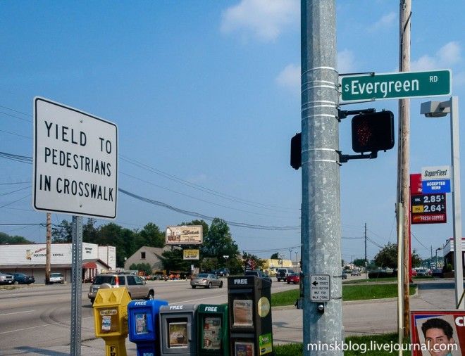 В США практически отсутствуют дорожные знаки в привычном для нас понимании. Почти все дорожные обозначения пишутся буквами, так, чтобы было понятно любому идиоту, освоившему латинский алфавит. Никаких кирпичей, желтых ромбов в белой окантовке или красных треугольников — все пишут словами: «уступите пешеходам», «ограничение скорости 50 миль в час», «пешеходный переход» и так далее.
