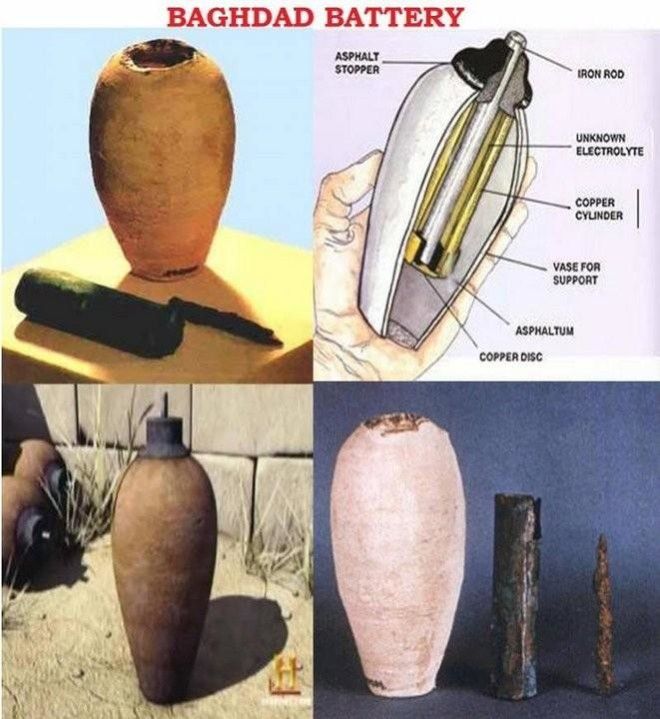 Знаменитая «багдадская батарея» и древнеегипетский рисунок с предметами, похожими на нее. Возможно, в древности люди знали электричество и умели его использовать.