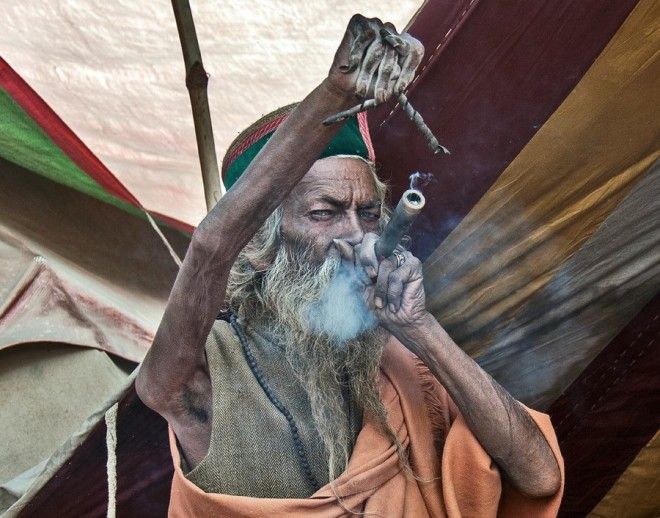 Рука Садху — костлявое высохшее нечто, ведь вот уже 40 лет, с 1973 года, он ею не пользовался. Он поднял ее над головой в знак преклонения перед богом Шивой.