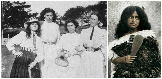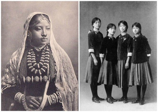 Япония. Слева — девушки майко (ученицы гейш) отдыхают на балконе. Справа — ученицы школы Фукуока, первого места, где ввели школьную форму в морском стиле.
