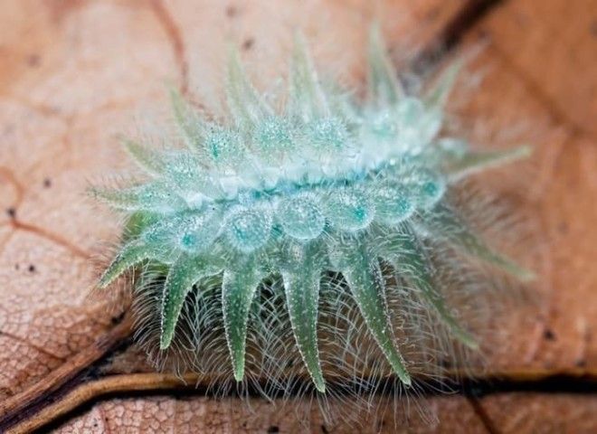 Десятки сверкающих, словно покрытых инеем иголок, украшают туловище этой гусеницы, придавая ей изящный, почти сказочный вид.