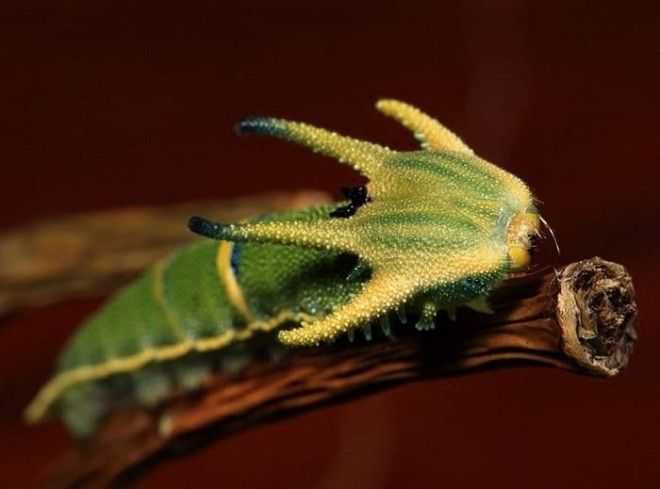 Роговой панцирь на голове гусеницы больше бы подошел доисторическому динозавру, чем этому маленькому существу.