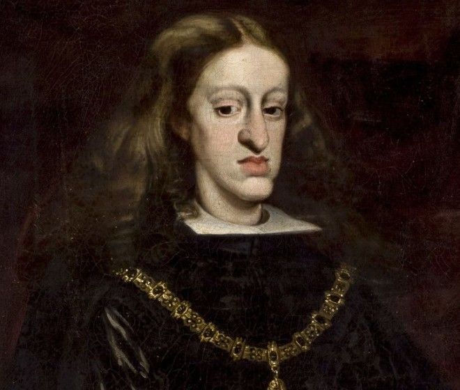 Приведем пример. На портрете выше изображен Карл II Безумный — последний представитель династии Габсбургов в Испании. Он стал, пожалуй, самой наглядной жертвой таких браков. В пятом колене у него было только 10 предков (у нормального человека их 32).