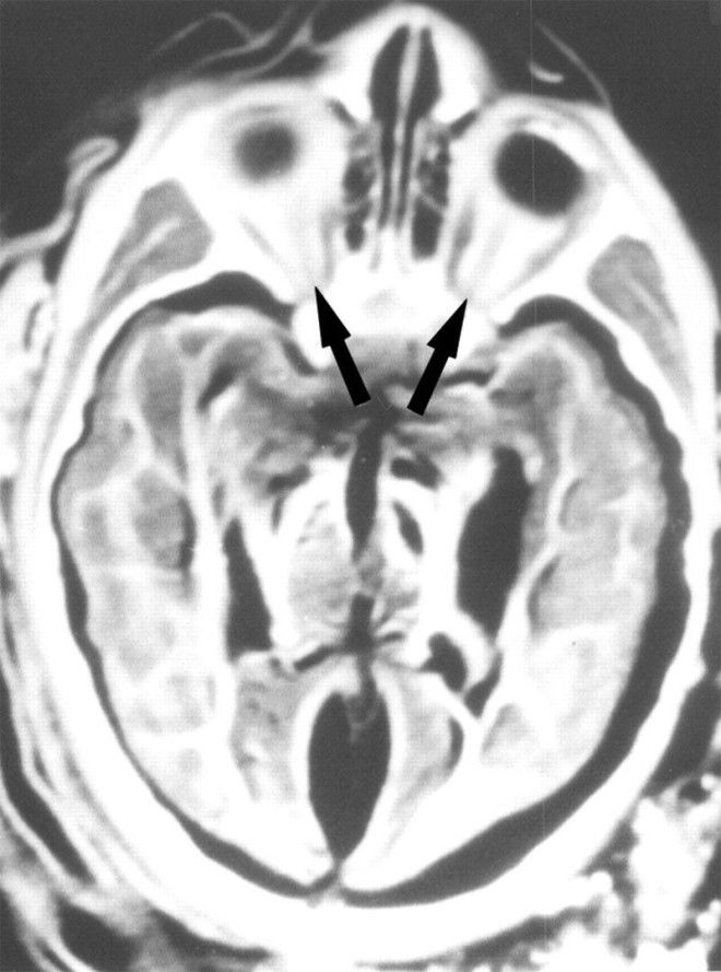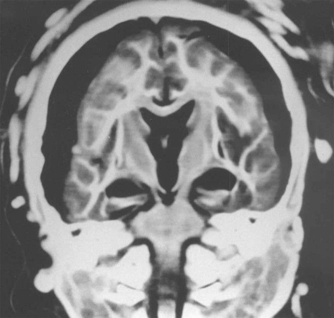 6. Рентген мозга 15-летней девочки показывает, что между белым и серым веществом мозга есть разделение. Стрелки указывают на воздух, окружающих мозг.