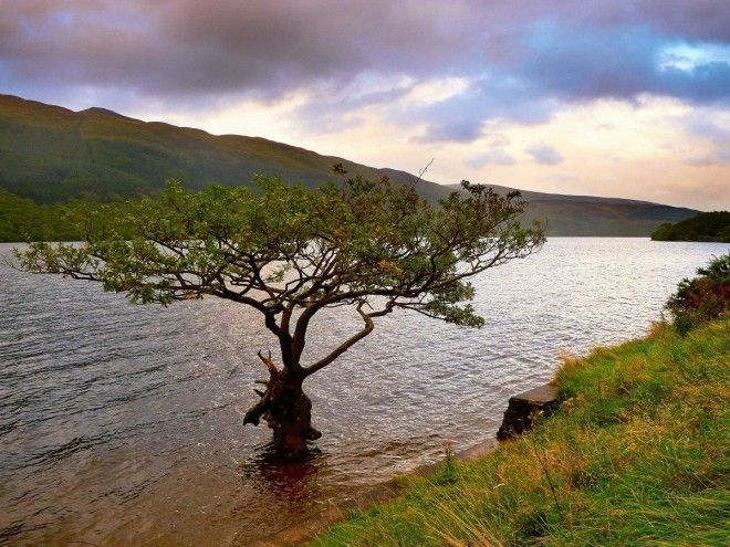 Некоторые деревья растут прямо в озере Лох-Ломонд, юго-запад Шотландии.