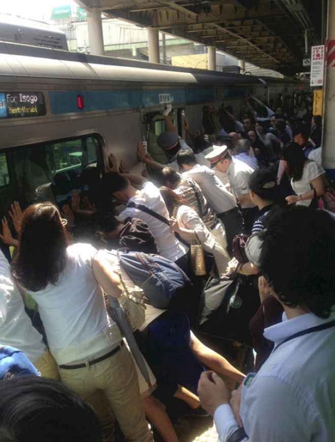 Пассажиры толкают поезд, чтобы спасти женщину, которая упала и застряла между вагоном и платформой.