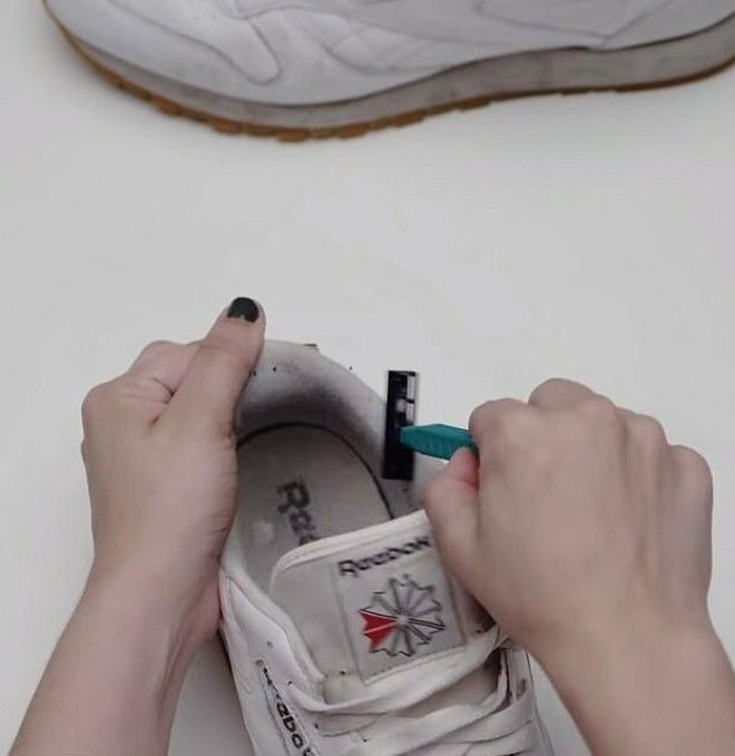 Шаг шестой: с помощью бритвы удалите катышки с внутренней стороны кроссовок.