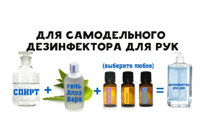 Смешайте три части спирта, одну часть геля алоэ вера и несколько капель любимого ароматического масла. Получившаяся смесь отлично дезинфицирует руки.