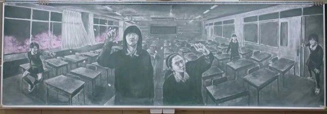Японские школьники, по-видимому, обожают классные доски, однако не потому, что решают там задачи, — на них они рисуют во время перемен. На волне популярности этого необычного увлечения компания по производству школьных досок Nichigaku устроила конкурс на создание лучшего рисунка. В мероприятии приняли участие 249 учеников из разных школ, которые общими усилиями представили 50 работ. Стоит отметить, что темы рисунков были выбраны самые разнообразные: от изображений горы Фудзи до фантастических пейзажей. Победители конкурса получили денежный приз в размере 100 000 иен (примерно 812 долларов).