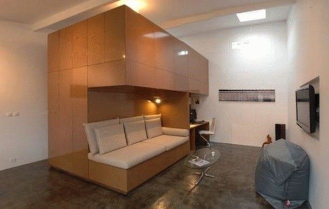 Другой шедевр — это комната в комнате. Эта концепция выполнена в форме куба, который скрывает от посторонних глаз ванную и гардеробную.
