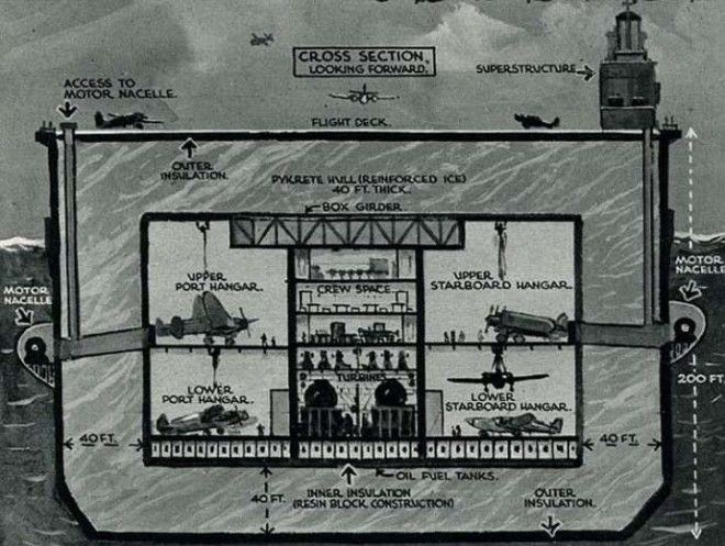 Планировалось построить проектное судно длиной 600 метров, шириной 90 метров и высотой 200 м в высоту. Водоизмещение судна, способного нести на борту 200 истребителей и разведчиков, составляло бы более 2 млн тонн, а его корпус был бы толщиной более 12 метров, что делало бы его неуязвимым для снарядов и торпед. Бортовая система охлаждения должна была поддерживать корпус замороженным благодаря ряду охлаждающих каналов в ледяных глыбах.