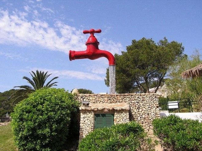 Громадный водопроводный кран красного цвета, зависший в воздухе можно увидеть у Санта-Гальдана, пляжа Менорка. Конструкция фонтана проектирована по всем правилам создания иллюзии парящего предмета: поток закрывает от глаз прозрачную трубу, которая и держит кран.