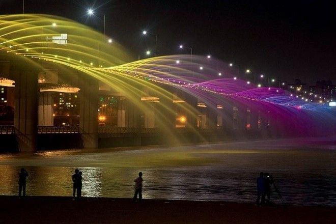 Фонтан-рекордсмен Книги рекордов Гиннеса расположен по обе стороны моста Банпо. Сумма длинны обеих его сторон составляет – 1140 метров. Вода этого инженерного чуда подсвечивается всеми цветами радуги, разливается на расстояние свыше 40 метров и попадает в фонтан из реки Ханган, через которую мост и проходит.