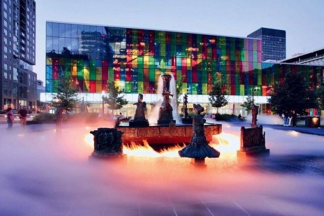Танцующий поток 300 струй фонтана, которые подсвечиваются таким же количеством прожекторов – произведение художника Исаму Ногучи. Сама конструкция представляет собой гранитный бассейн, от него идут две опоры из нержавеющей стали, поддерживающие кольцо.