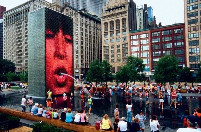 В парке Миллениум по обе стороны дренажной площадки красуются две башни из стекла пятнадцать метров в высоту. Вода стекает по поверхности. Светодиоды на этих конструкциях образуют лица горожан, которые сменяются друг за другом. Когда лицо на изображении складывает губы в трубочку, оттуда бьет струя воды.