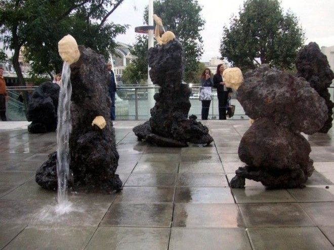 Брутальные статуи шестерых людей, будто вмурованные в камни. Они стоят в странных позах и извергают струи воды из самых неожиданных мест: ноздрей, подмышек, ртов. Скульптуры находятся перед Королевским фестивальным залом на южном берегу Темзы.