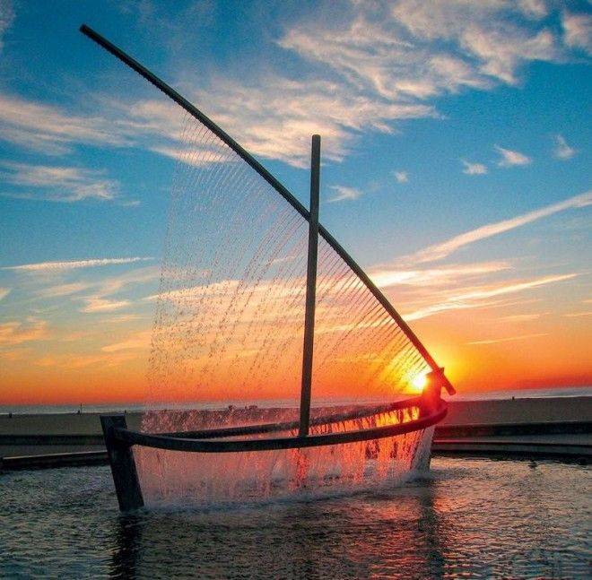 Жесткие трубы расположены, эмитируя каркас лодки, а с них вылетают струйки, которые будто рисуют в воздухе парус и борт. Похожие фонтаны можно увидеть в Португалии и Израиле.