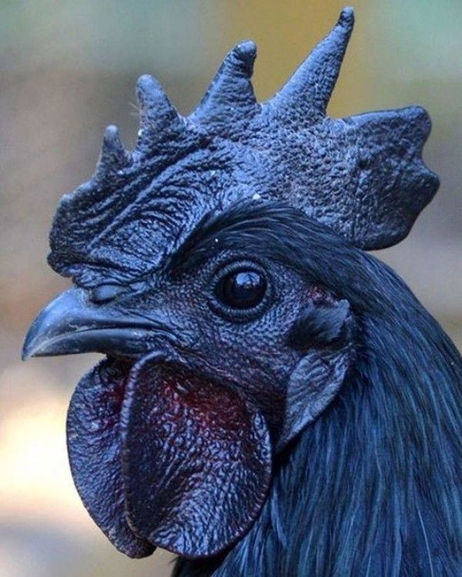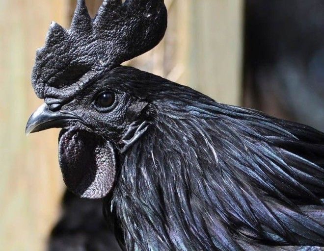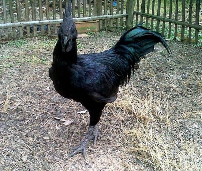 Эти бойкие обитатели Суматры обладают не только черными перьями, но и гребнем, такой гребень часто бывает и у других пород кур, даже у Chabo, однако, цвет мяса, костей и даже цвет крови у Ayam Cemani черный.