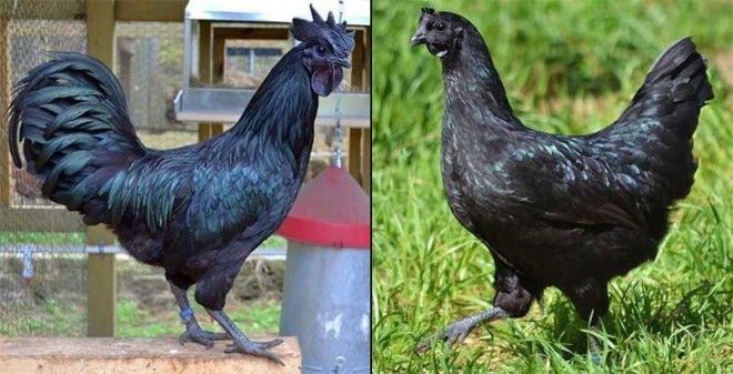 Куры этой породы полностью черные – от гребешка и клюва до когтей. Черные перья этих птиц имеют красивый изумрудно-фиолетовый отлив. По словам фермера, мясо и внутренние органы этой породы тоже имеют черный цвет, который сохраняется после приготовления.