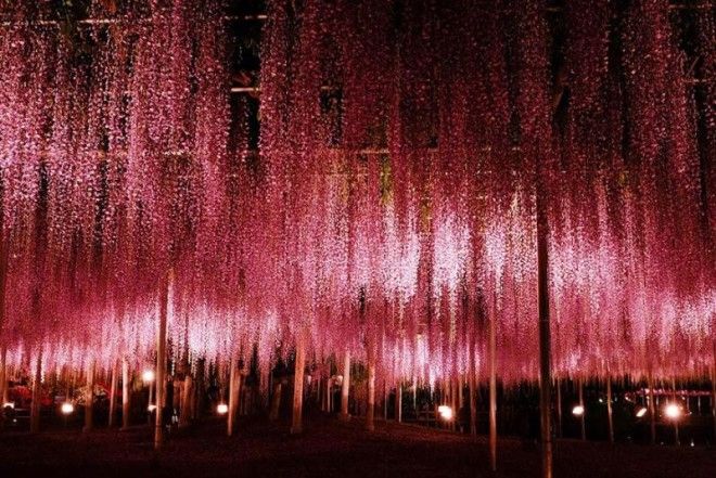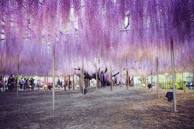 Хотя глицинии иногда похожи на деревья, на самом деле это вьющиеся лианы. Так как лоза становится увесистой, всю её разросшуюся структуру удерживают стальные опоры, что позволяет посетителям ходить под навесом из розового и лилового света, отбрасываемого прекрасными нависшими цветами.
