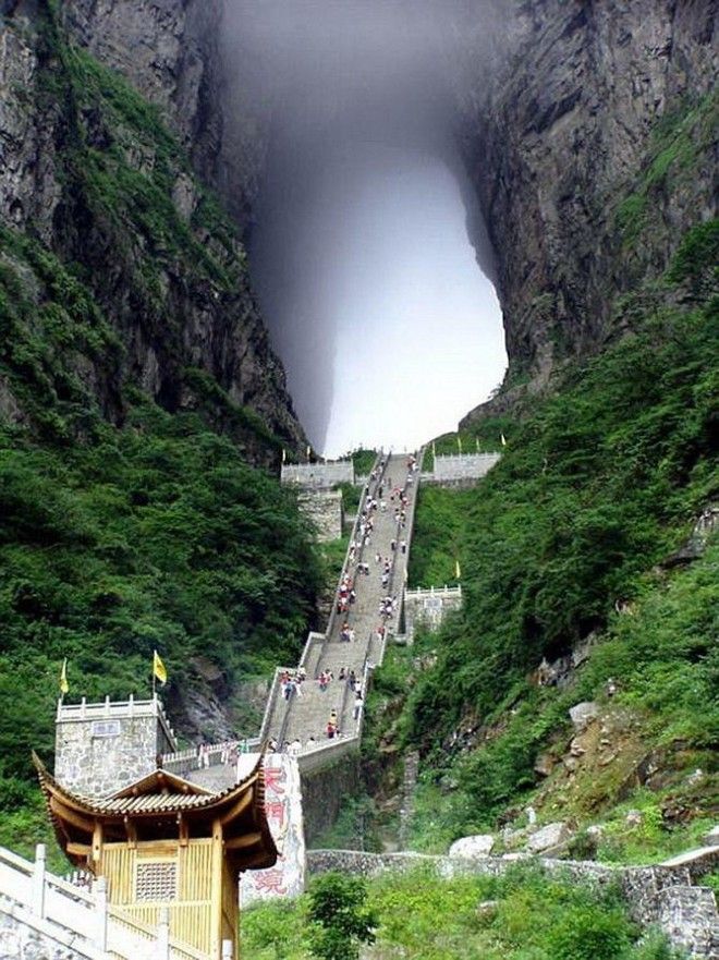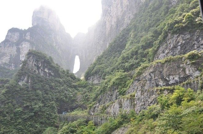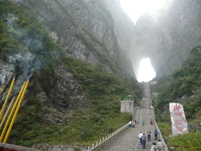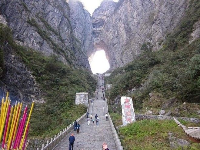 Всего в восьми километрах к югу от города Чжанцзяцзе (Китай) на северо-западе провинции Хунань, в Национальном Парке горы Тяньмэнь находится необычный объект природного происхождения - огромная естественная арка в карстовых породах горы Тяньмэнь или Тяньменьшань (Tianmen Shan), называемая -«Небесные ворота» или же пещера «Тяньмэнь» (Tianmen Cave).