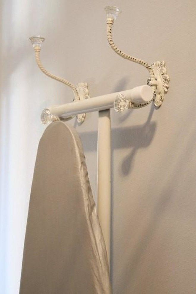 Чтобы закрепить доску на стене, используйте металлические крючки для верхней одежды. Их обычно применяют в прихожих, они более надежны и смогут выдержать нагрузку. Закрепи на стене два таких крючка — и смело вешайте на них гладильную доску.