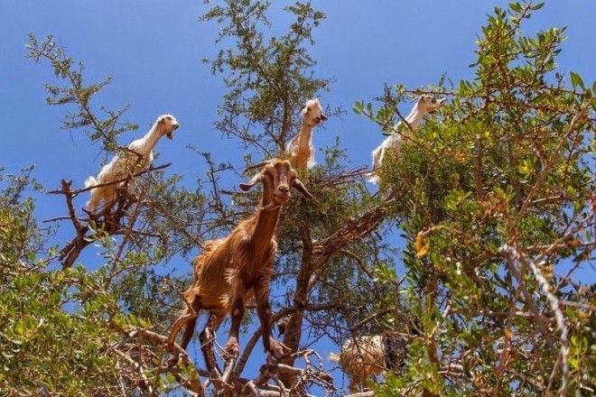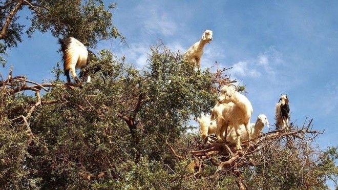 Особым лакомством для коз являются плоды дерева аргана, которые созревают в июне. Такие деревья достигают 8-10 метров в высоту и живут около 150-200 лет. Они колючие, с узловатыми стволами, но домашние парнокопытные на протяжении веков научились справляться даже с такой нелегкой задачей.