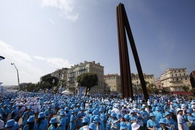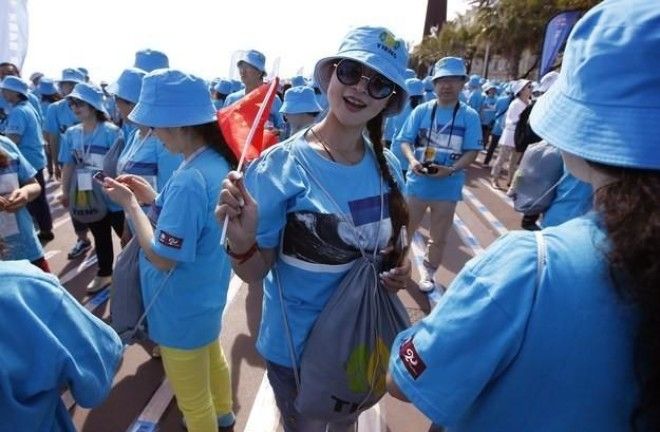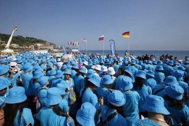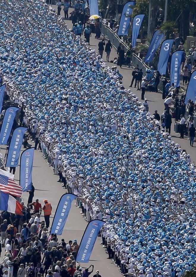 В пятницу почти 150 автобусов привезли гостей на Английскую набережную в Ницце, где они выстроились в самую длинную "живую" фразу в мире: "Ницца на Лазурном берегу - мечта "Тяньши".