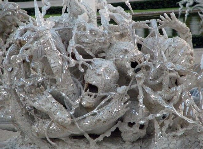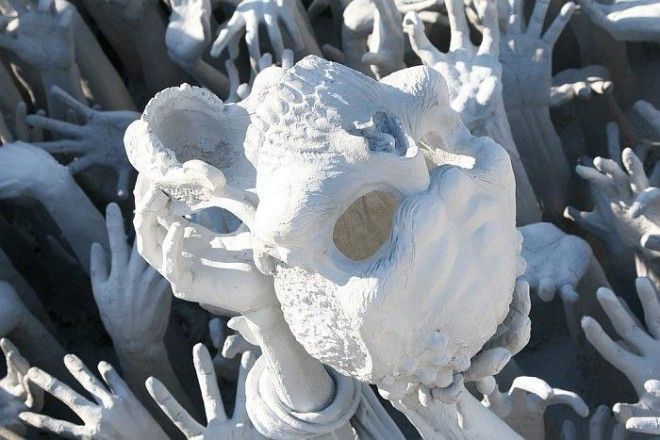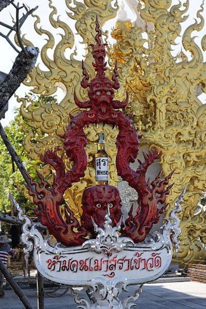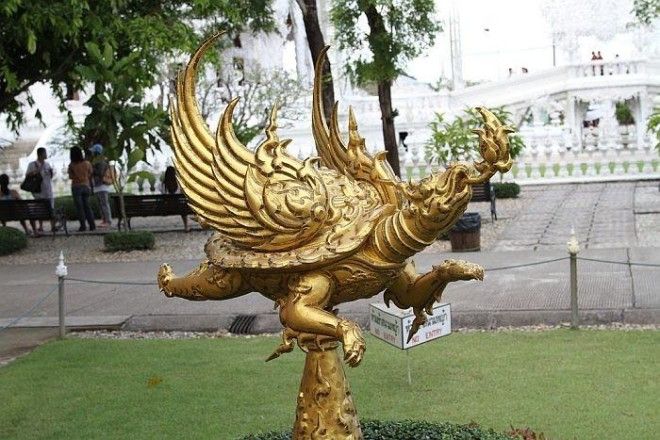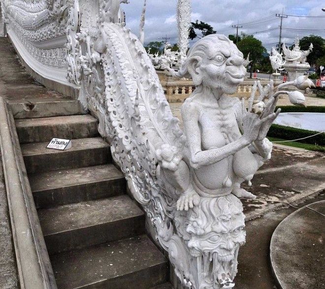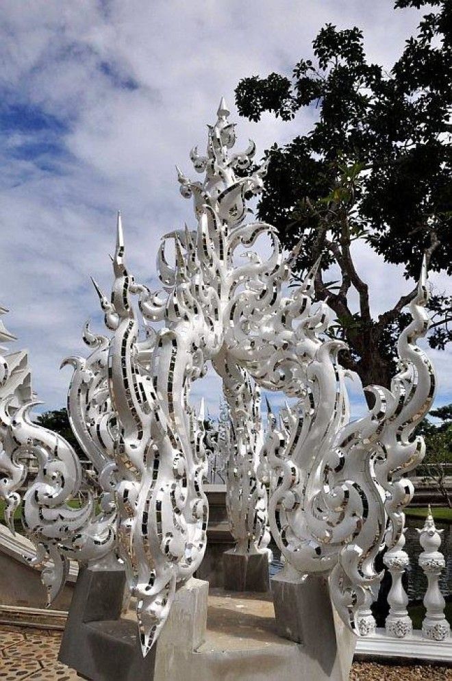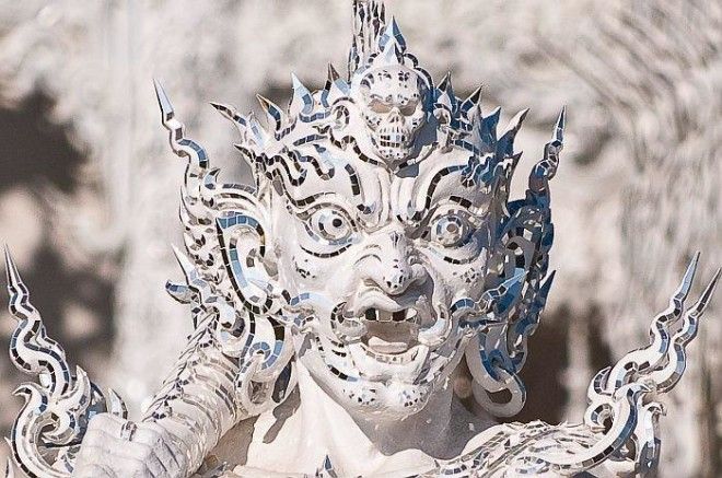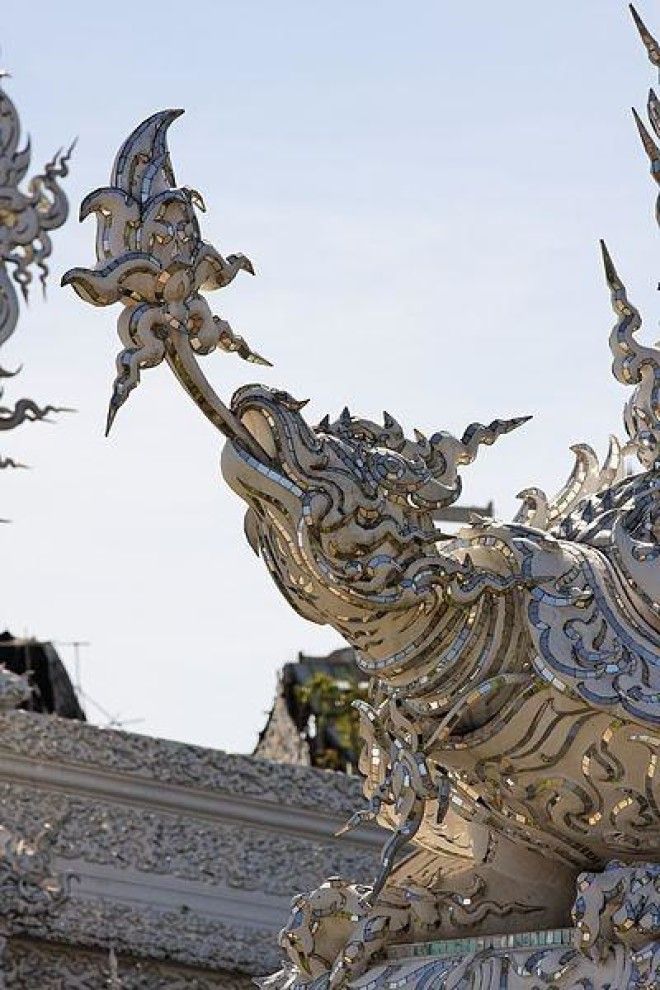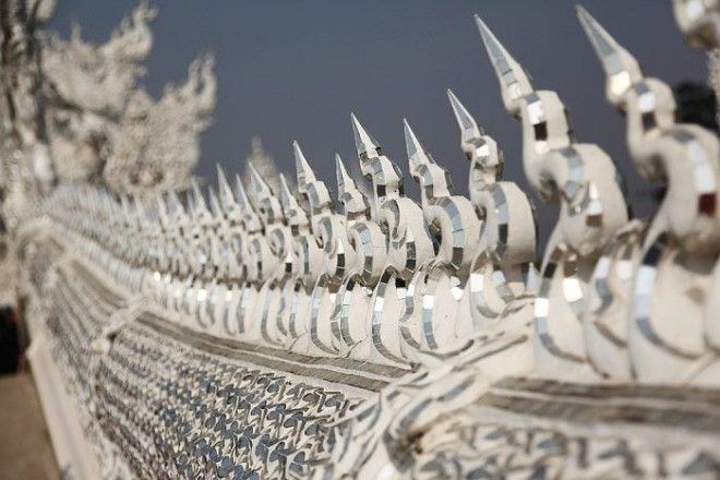 Проходя к храму Wat Rong Khun, Вас по дороге встретят много фигур и статуй, крышу украшают разнообразные животные символизирующие природные стихии, можно долго-долго рассматривать, все настолько красиво, что идти к самому храму можно очень долго.