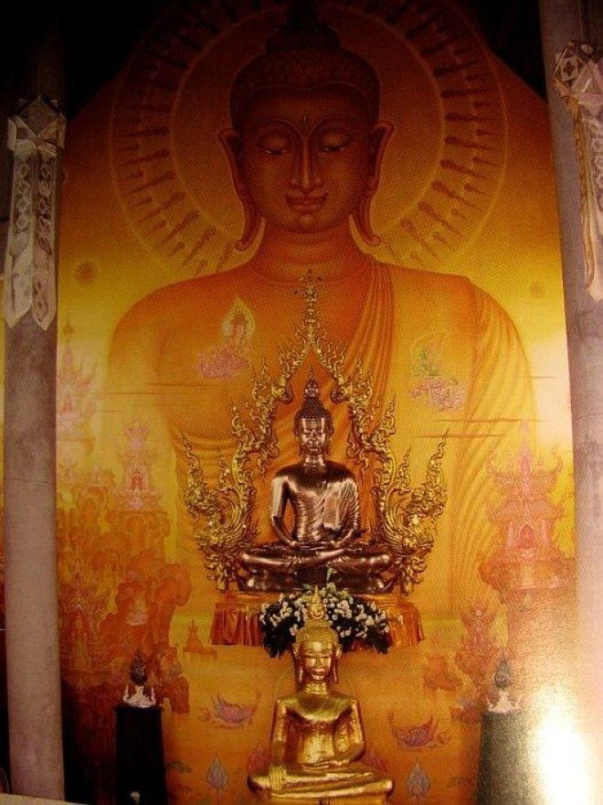 В здании разместились две статуи Будды и большое его изображение, противоположная стена украшена росписью самого художника, которая отождествляет вечную битву между добром и злом.