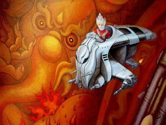Вместо изображений героев, сражающихся демонов, художник решил взять современное проявления добра и зла, и положить его в буддийском контексте.