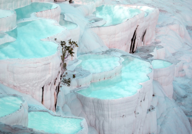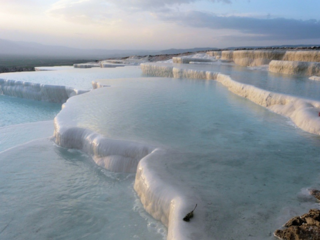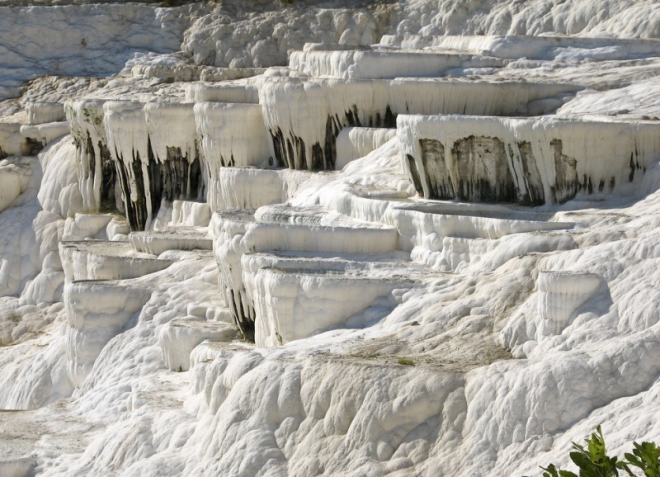 Травертины – естественный парк Памуккале в Турции неподалеку от города Анталия. Слово «памуккале»на самом деле переводится как «Хлопковый замок«, потому, что из далека оно напоминает огромные хлопья ваты или пуха.