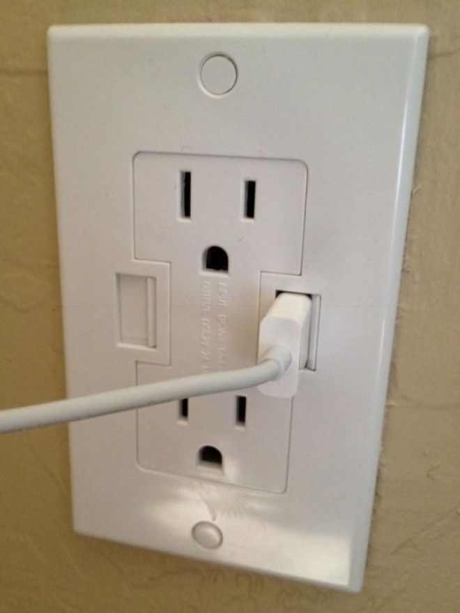 USB-разъем в розетках. Можно подключить и подзарядить всё и сразу.
