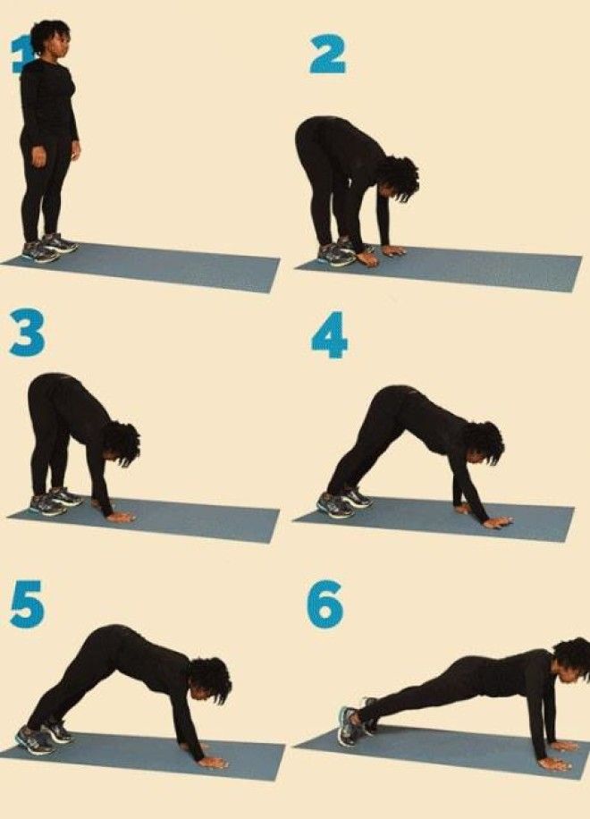 Напрягай пресс, когда идешь руками вперед, пока твое тело не станет ровным как линия. Шагай руками обратно в позицию стоя.