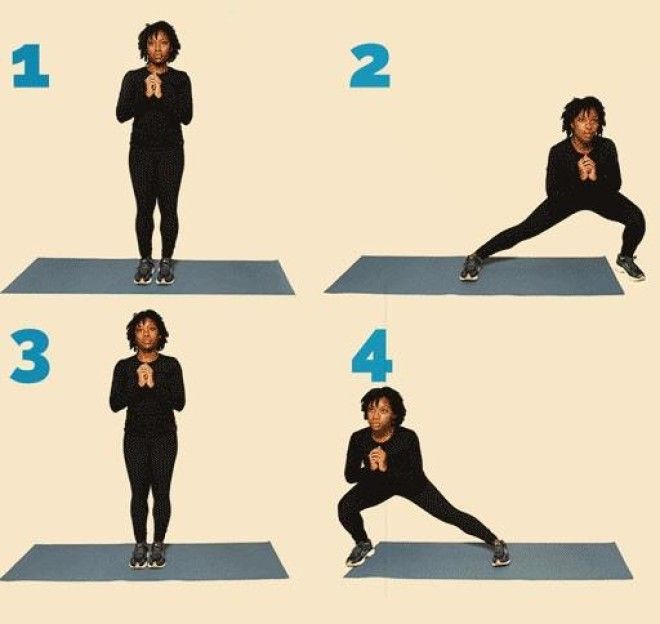 Сделай выпад назад так низко, насколько позволяет гибкость, не касаясь коленом пола.